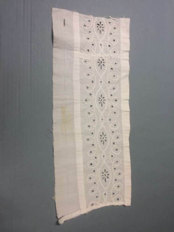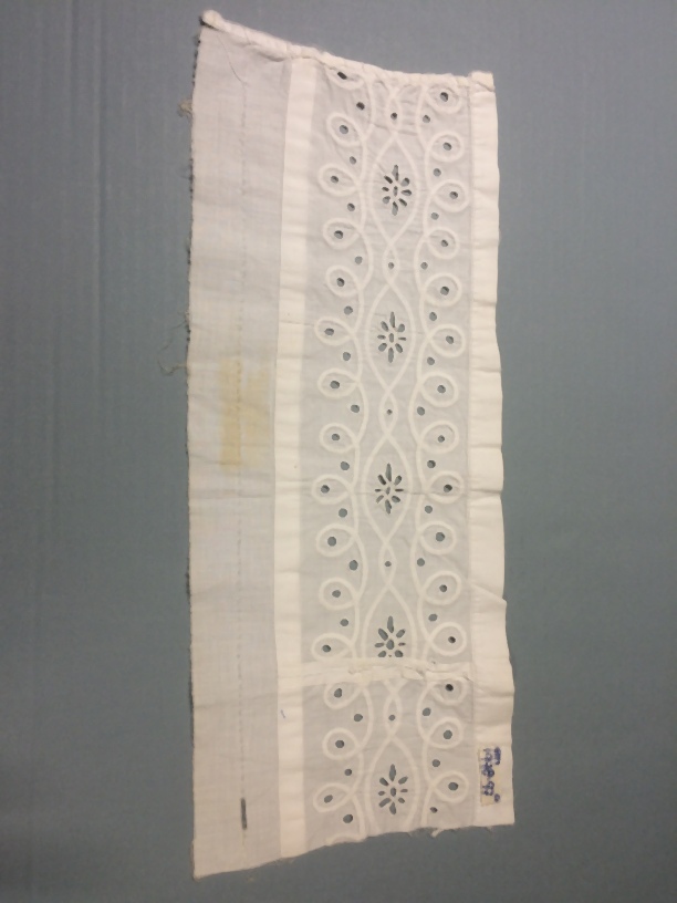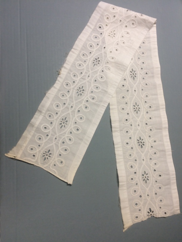 Twee stroken tussenzetsel van wit katoen voor een laken of sloop met engels borduurwerk