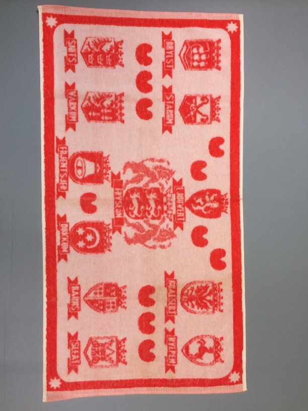 Katoenen badhanddoek in de kleuren oranje en wit met pompebêden, wapens met namen van Fryslân en de elf steden
