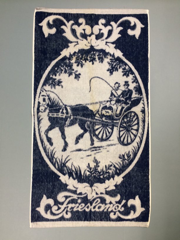 Katoenen badhanddoek in de kleuren blauw en wit met man en vrouw in Fries Kostuum op sjees
