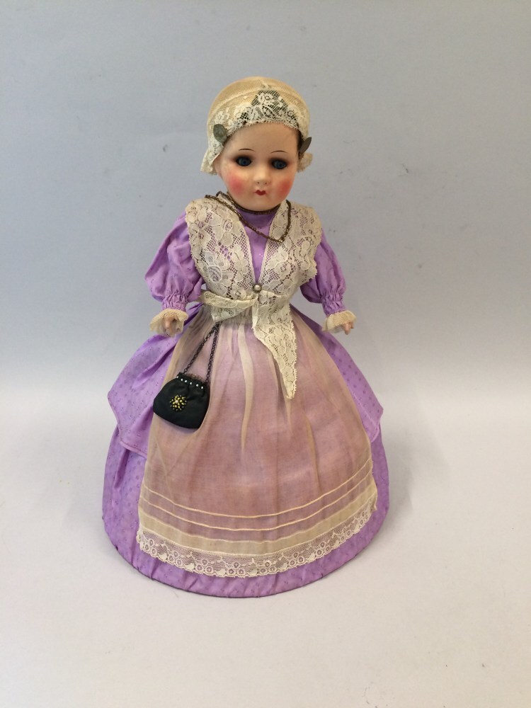 Pop tot taille, daarna bekleed ijzeren frame met zogenaamd Fries kostuum bestaande uit lichtpaarse rayon floddermuts of oorijzer, tipdoek en schort (theemuts?)