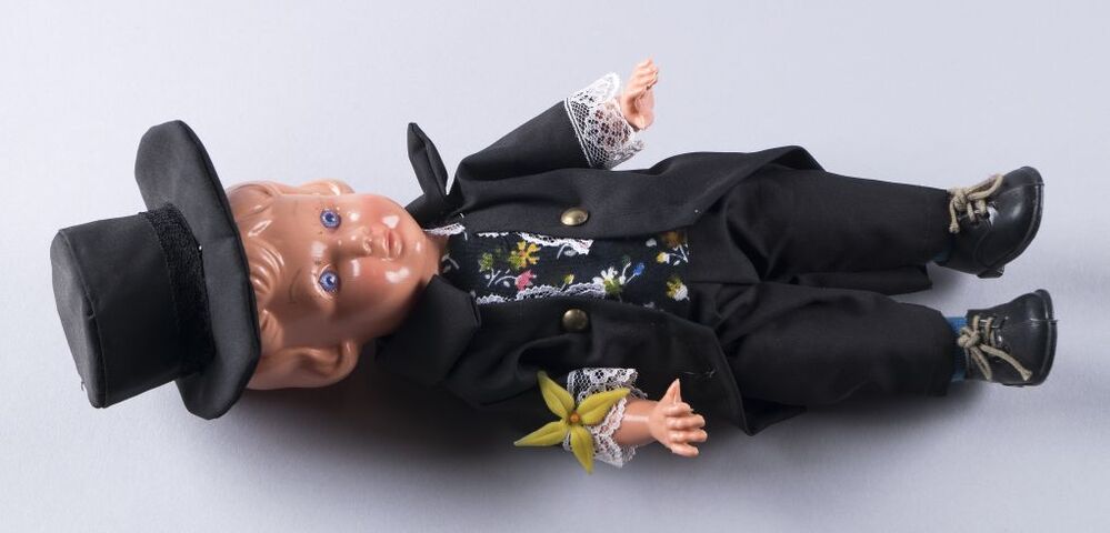 Roze kunststof pop, man, kleding veelal gespeld, slechte kopie Fries Kostuum