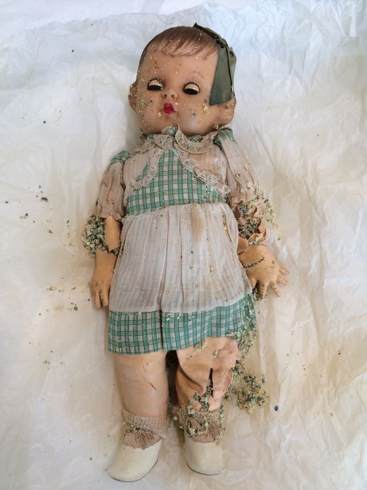 Pop van huidkleurig gummy met gemodelleerd haar en bruine slaapogen. Draagt wit-groen jurkje, een onderbroek en een groene strik