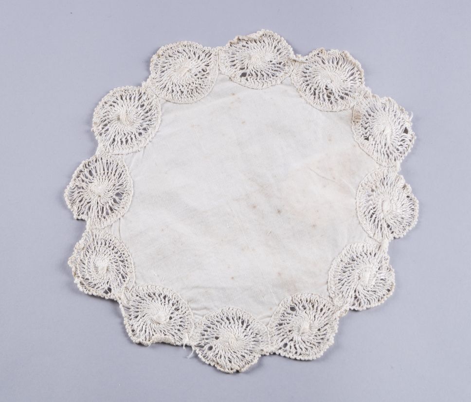 Rond kleedje van wit katoen: rondom 12 cirkels van tenerife-borduursel