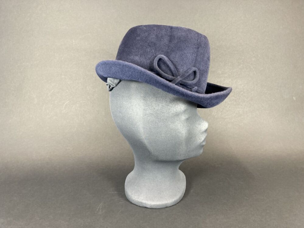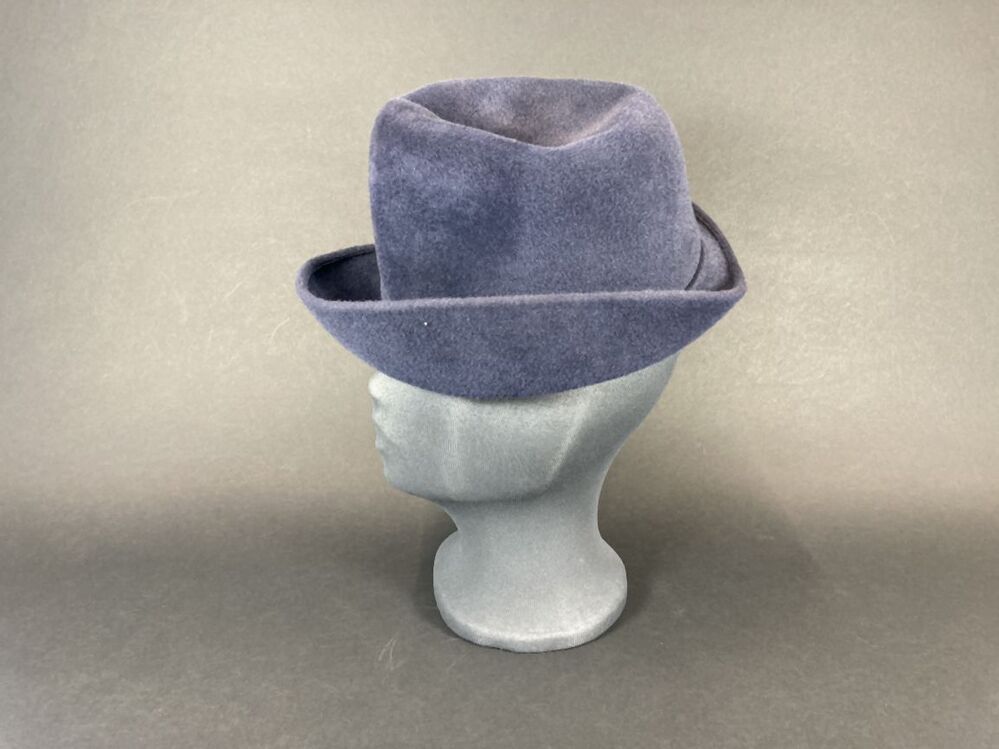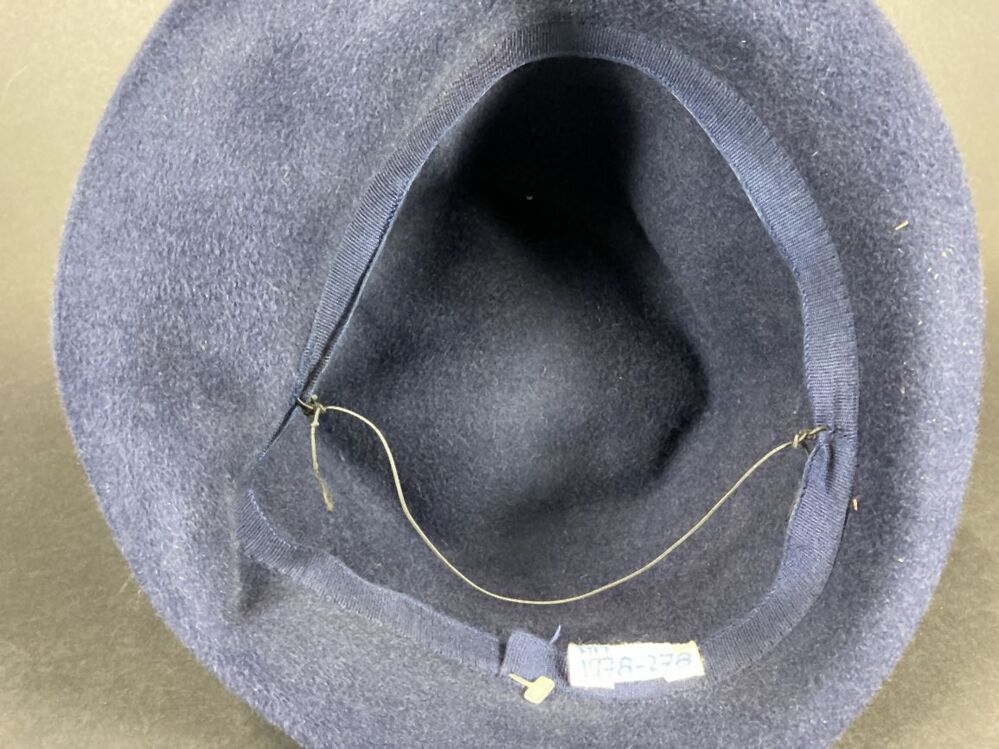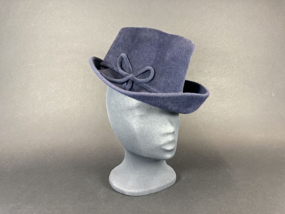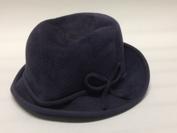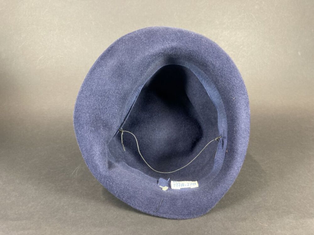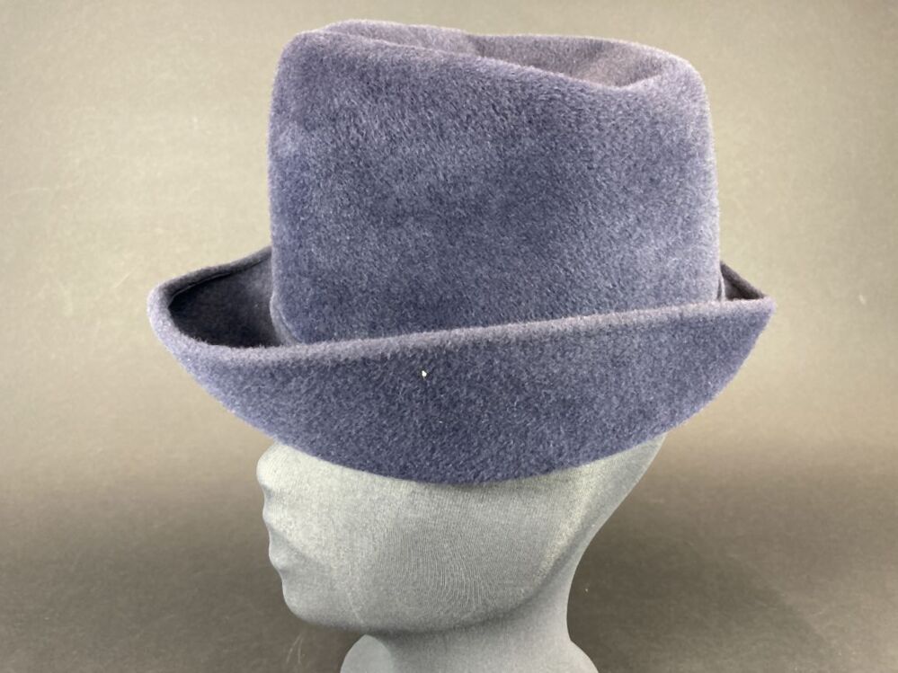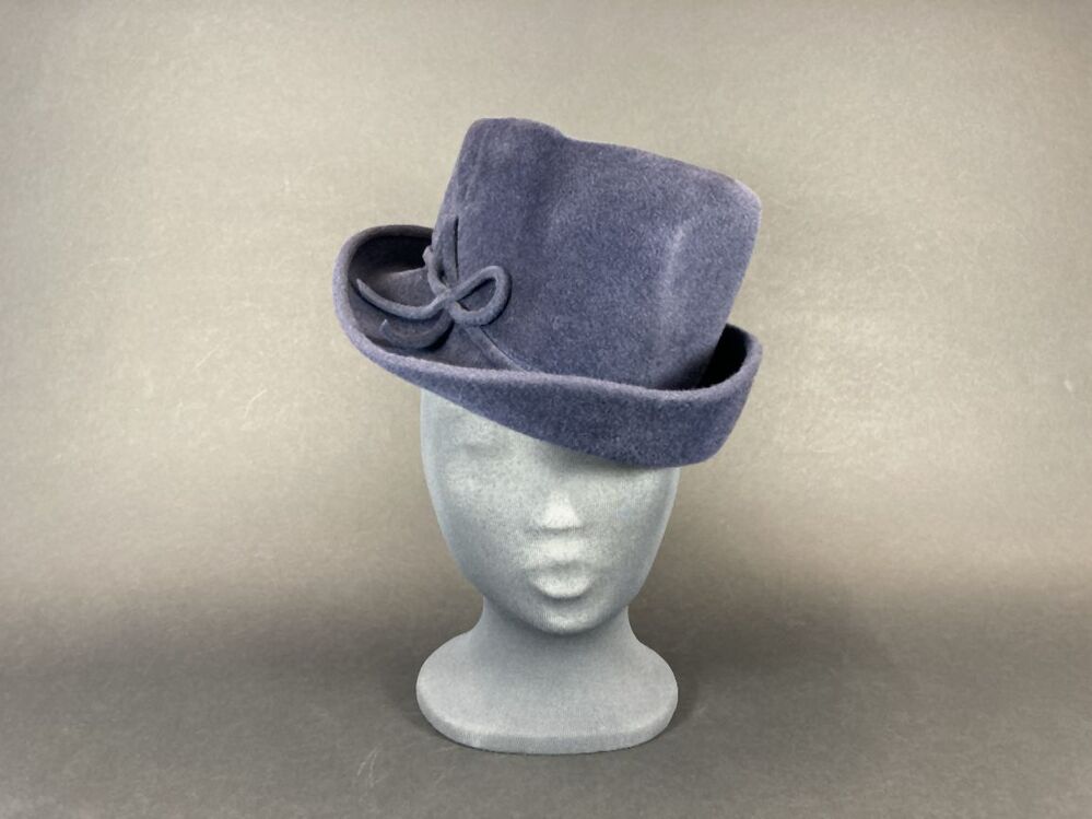 Donkerblauwe vilten hoed, hoge bol met asymmetrisch opstaande rand