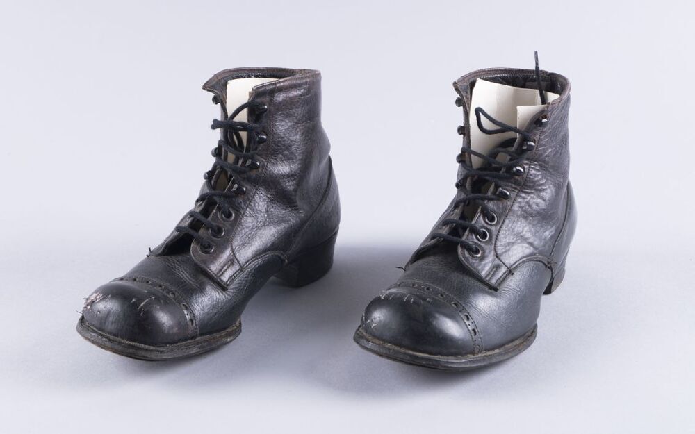 Paar schoenen van zwart leer met bovenop ijzeren ogen en haakjes