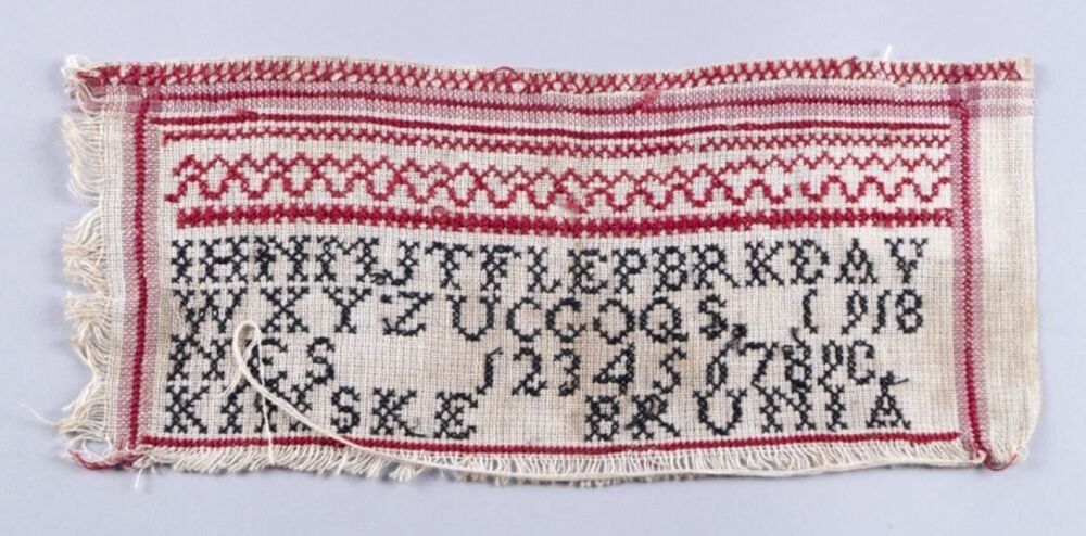 Letterlap geborduurd in kruissteek in rood en zwart, gemaakt door Kinske Brunia, 1918