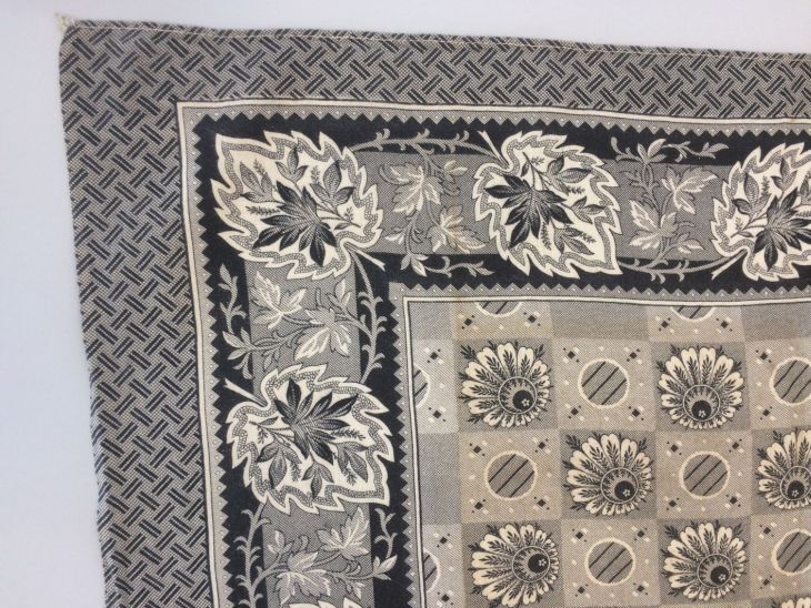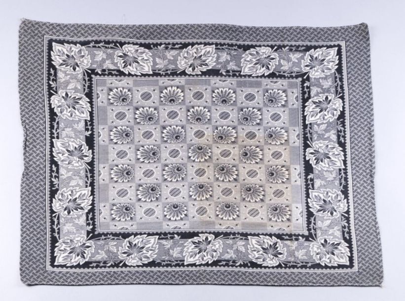Bedrukt katoenen doek met rand in vlechtmotieftweede rand met bladvormen en geblokt midddenveld met gestileerde bloemen