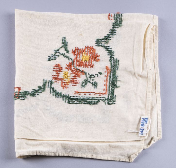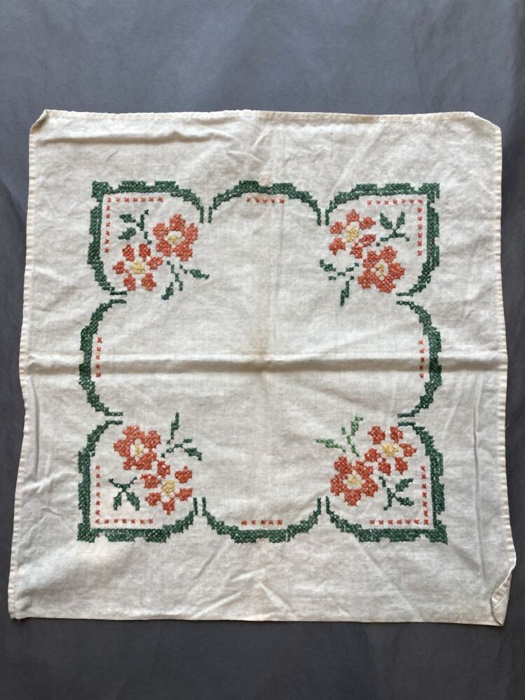 Kleedje van écru katoen, kruissteek geborduurd, groene vierpas, waarin oranje-gele bloemen