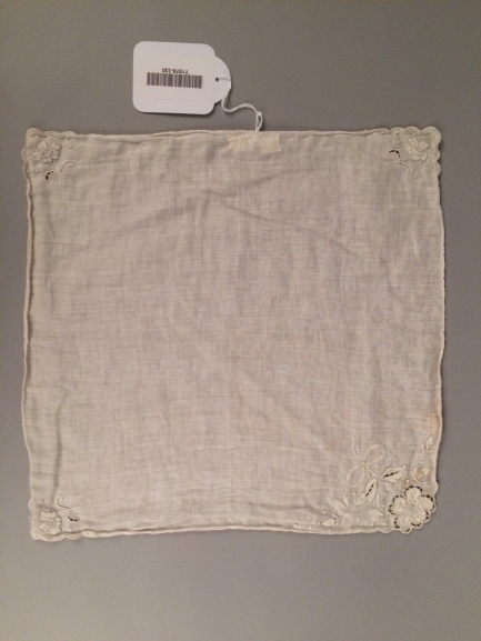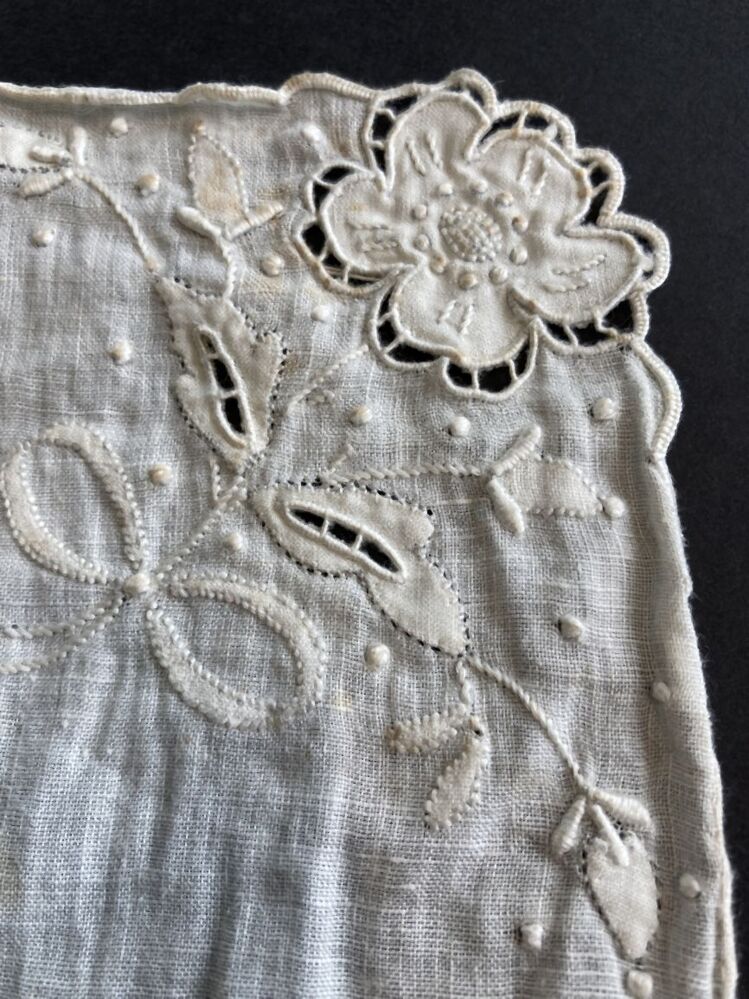 Zakdoek van wit batist, schaduwwerk, richelieu en applicatie van bloemmotieven