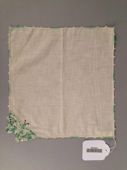 Zakdoek met gehaakte rand en vlinder in een hoek, met groen in kleur verlopend garen