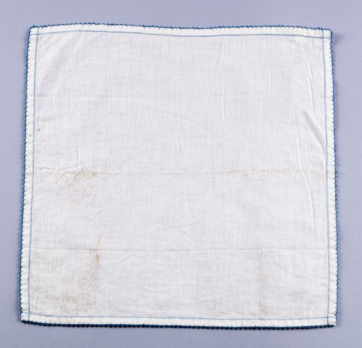 Zakdoek van wit katoen met blauw gehaakt randje en open blauw zoompje