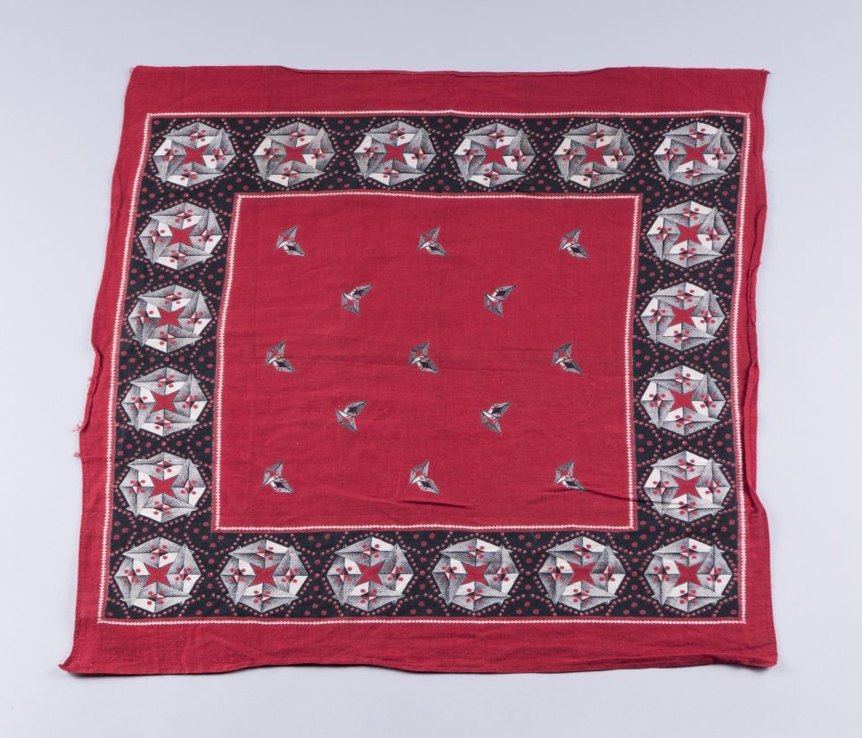 'Rode' zakdoek van katoen, bedrukt met rood en zwart en wit uitgespaard, rand met geometrische rozetten.