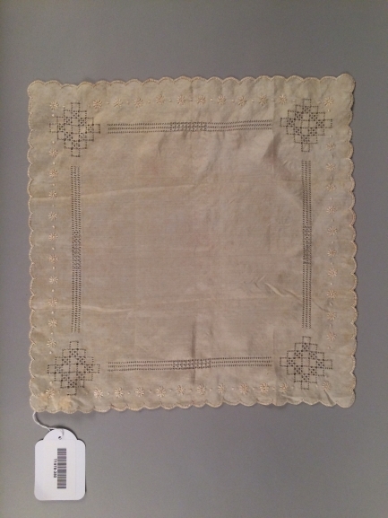 Zakdoek van crême-witte pongézijde met open naaiwerk randen en geborduurde bloemetjes