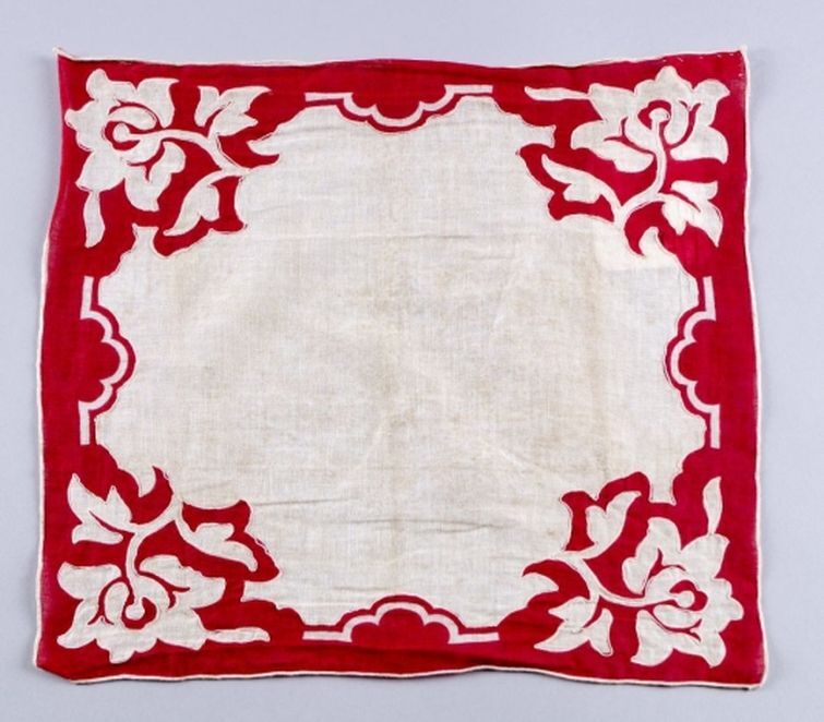 Zakdoek van, wit batist, met rode gedrukte rand met uitgespaarde bloemen en wit stiksel langs de omtrek.
