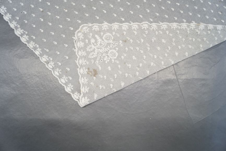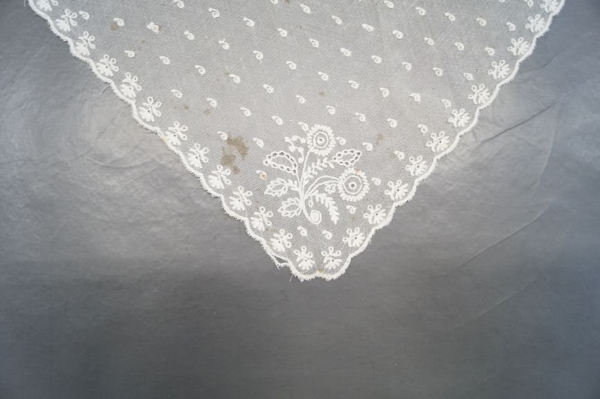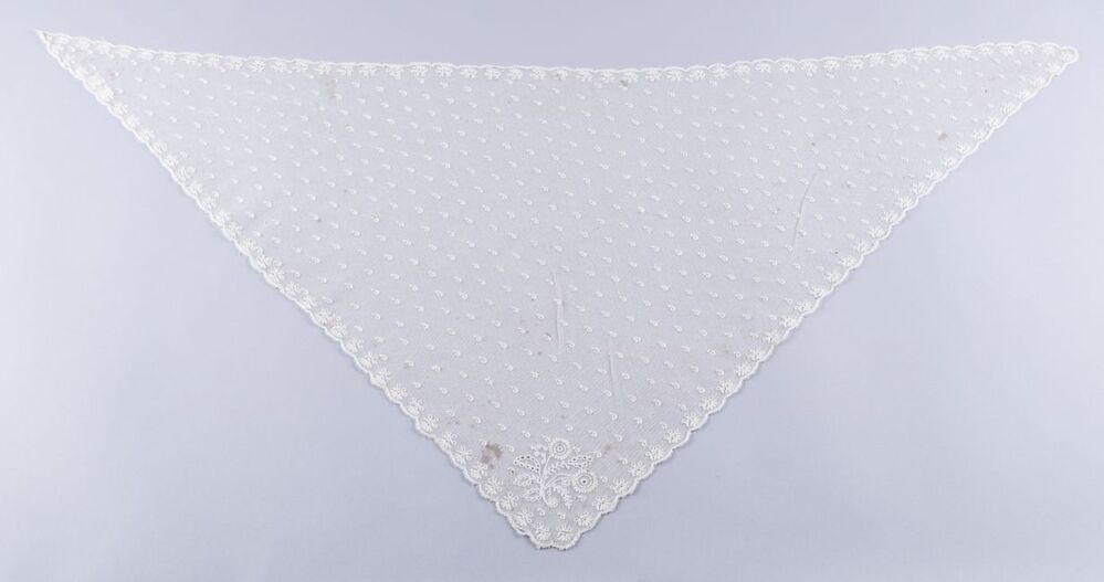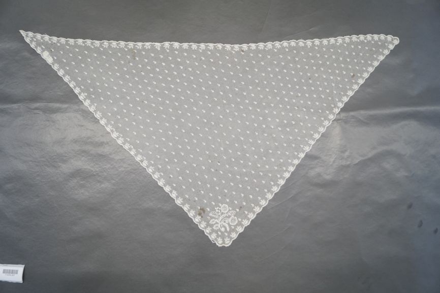Fichu met tamboereerwerk met 'kommaatjes' en bloemmotiefjes in de geschulpte rand.
