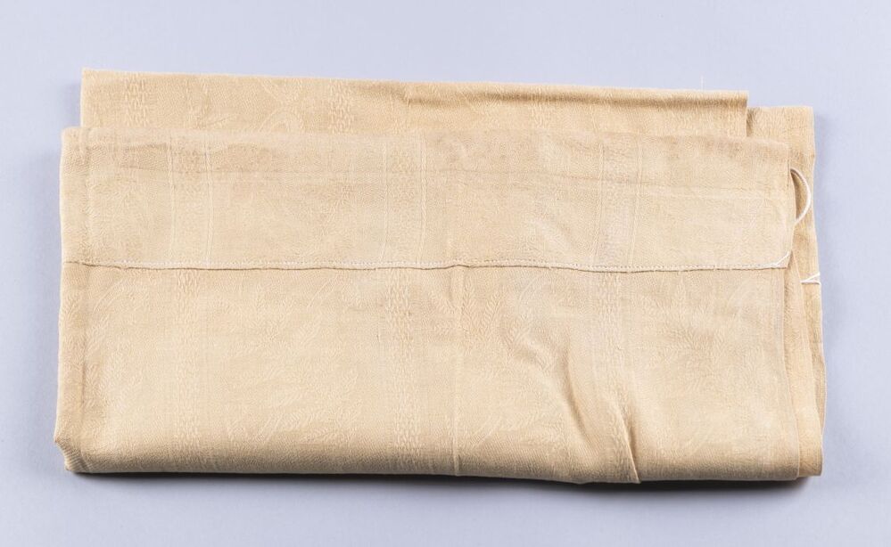Gordijntje van gele katoen, met jacquard geweven banen met bladertakken