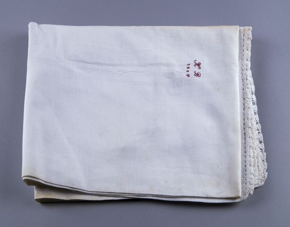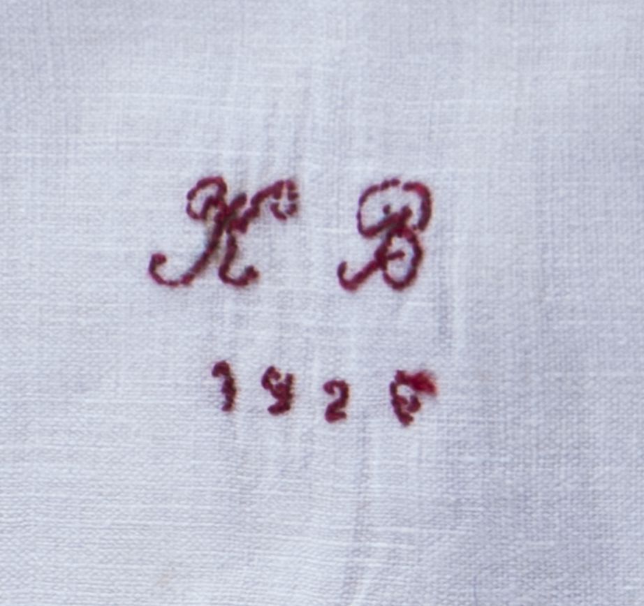 Peluwsloop van katoen met aan de beide korte zijden stroken van gehaakt katoen, gemerkt K.B. 1926