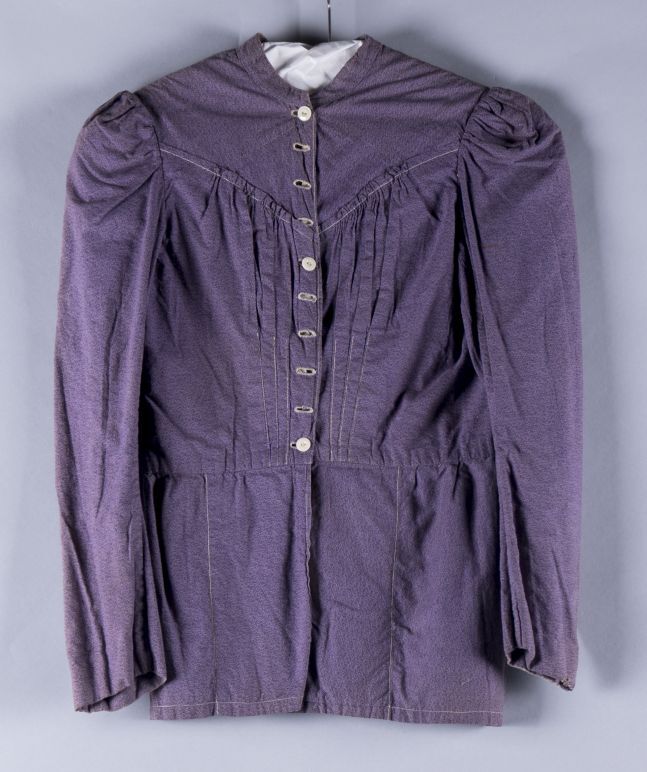 Eenvoudig vrouwenjak van paars bedrukt katoen, knoopsluiting, lange kopmouwen