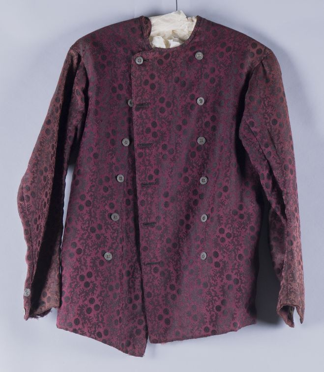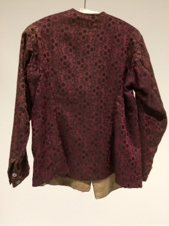 Baeitje of mannenvest van paars-rode damast met ingeweven zwart patroon