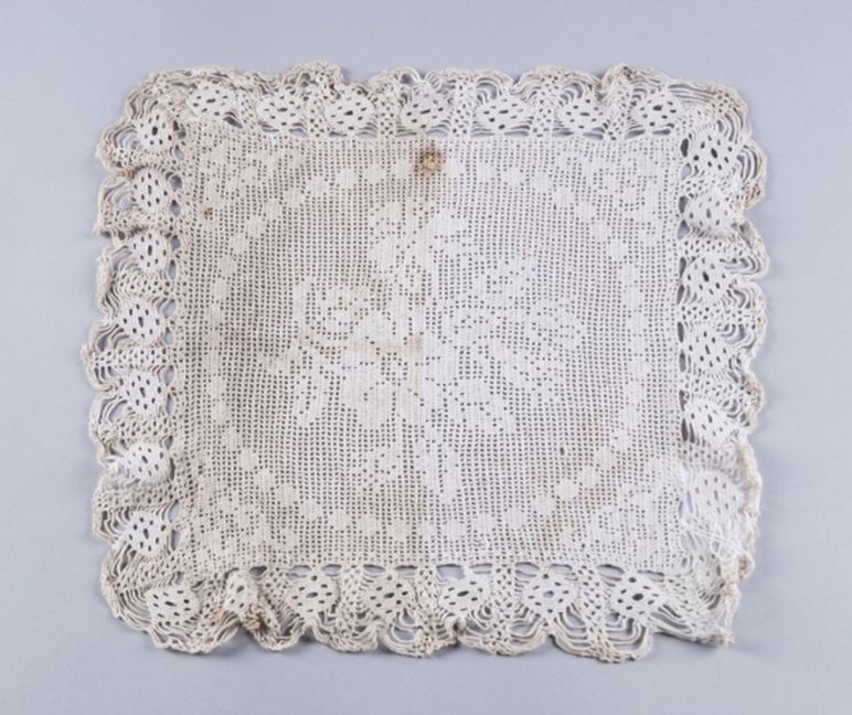 Kleedje, gehaakt van witte katoen, groot roosmotief in cirkel