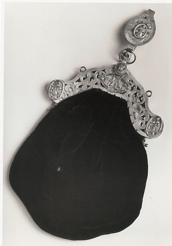 Beugeltas van zwart fluwelen tas met lila zijden voering waaraan twee accoladevormige buitenbeugels