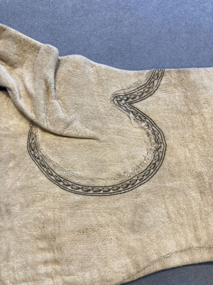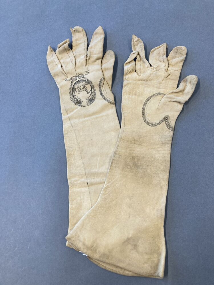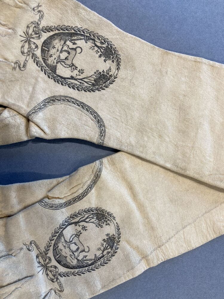 Paar zeemleren handschoenen uit de patriottentijd, bedrukt met keeshond