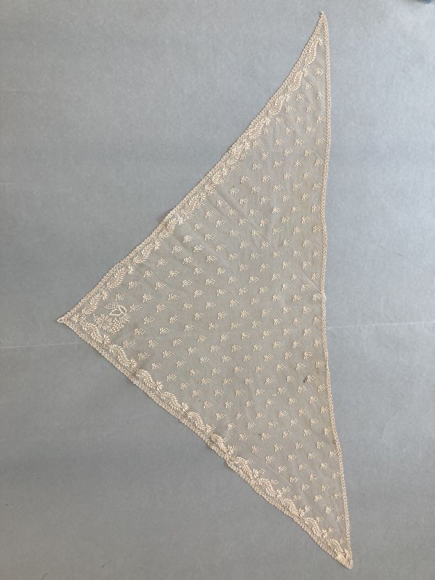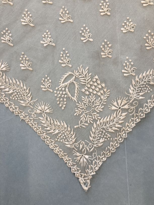 Witte tule fichu geborduurd met bladerranken en strooimotiefjes