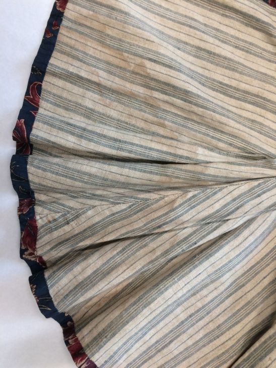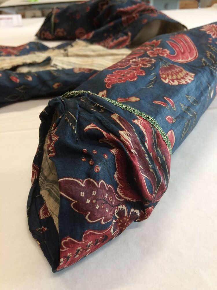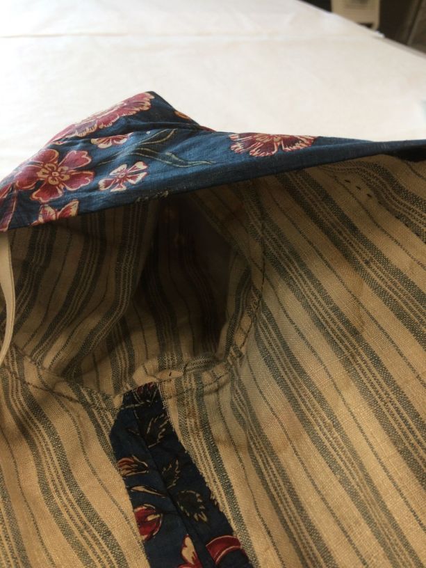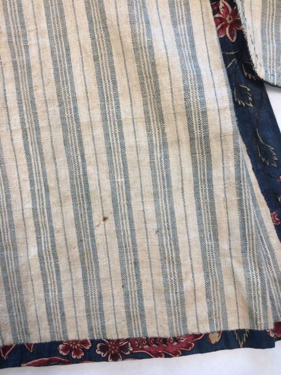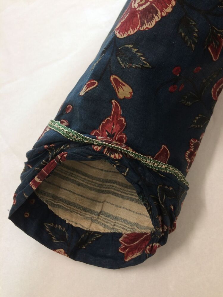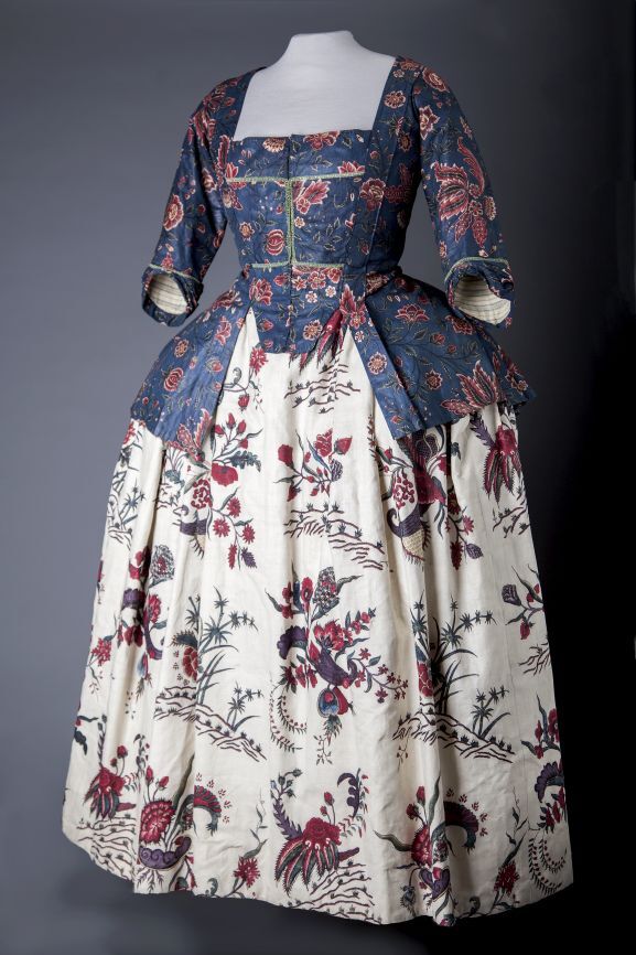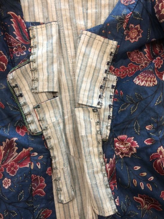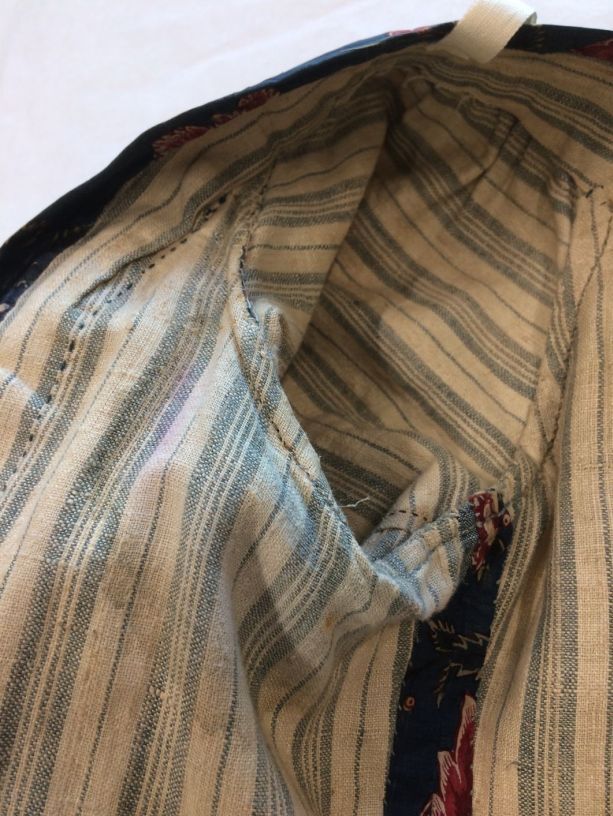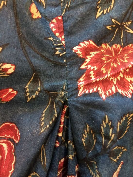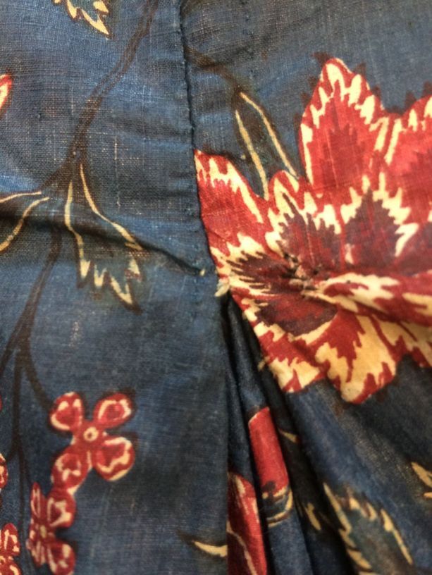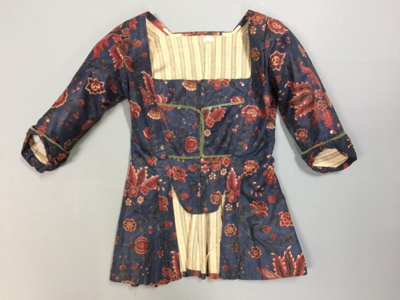 Sitsen vrouwenjak, met dubbele vestpandjes en geplooide schoot, met a-symmetrische bladmotieven met gevarieerde bloemen op blauwe grond