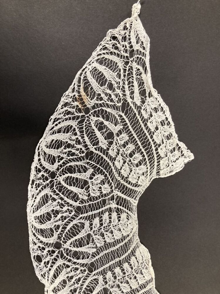 Rond kraagje van wit katoen, ajour gebreid met geschulpte zoom