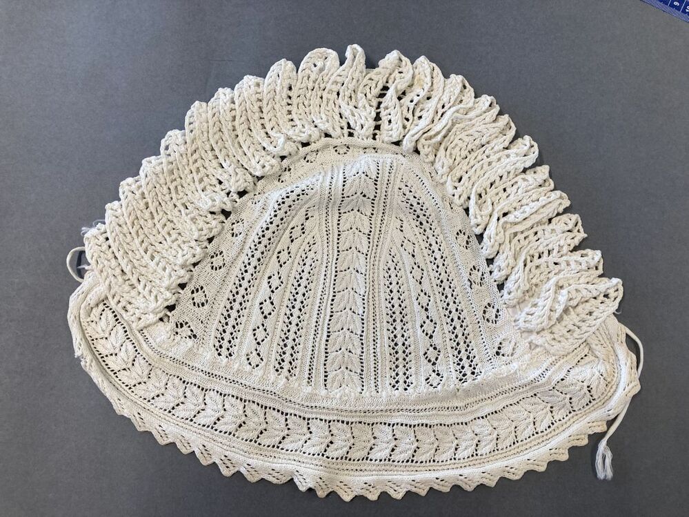 Morgenmuts van wit katoen met gebreide bol en gehaakte hanenkam