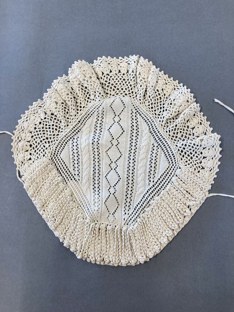 Morgenmuts van wit katoen, ajour breiwerk met hanenkam