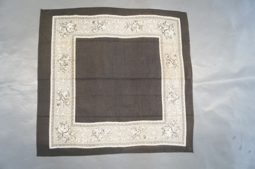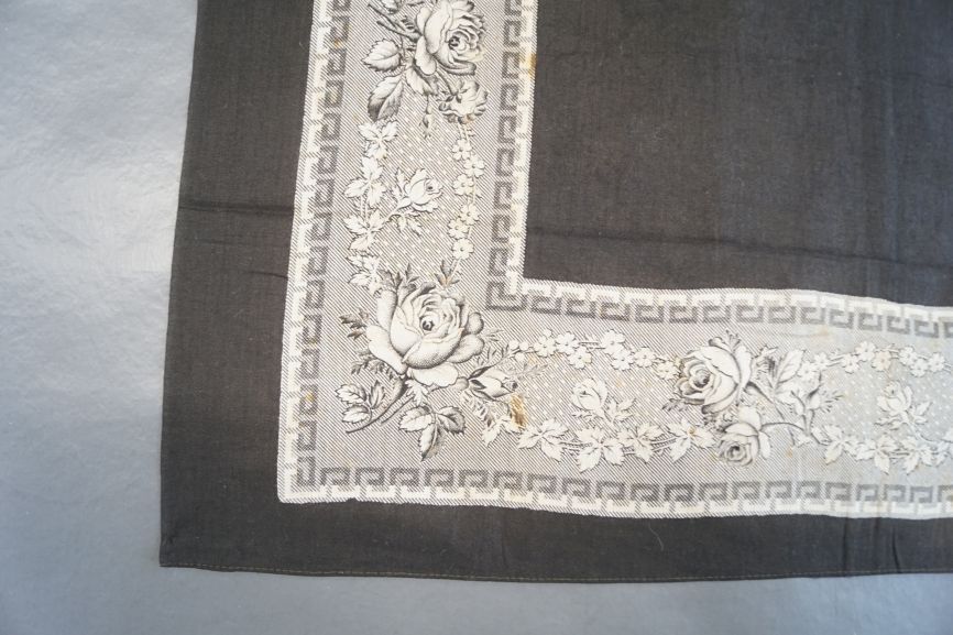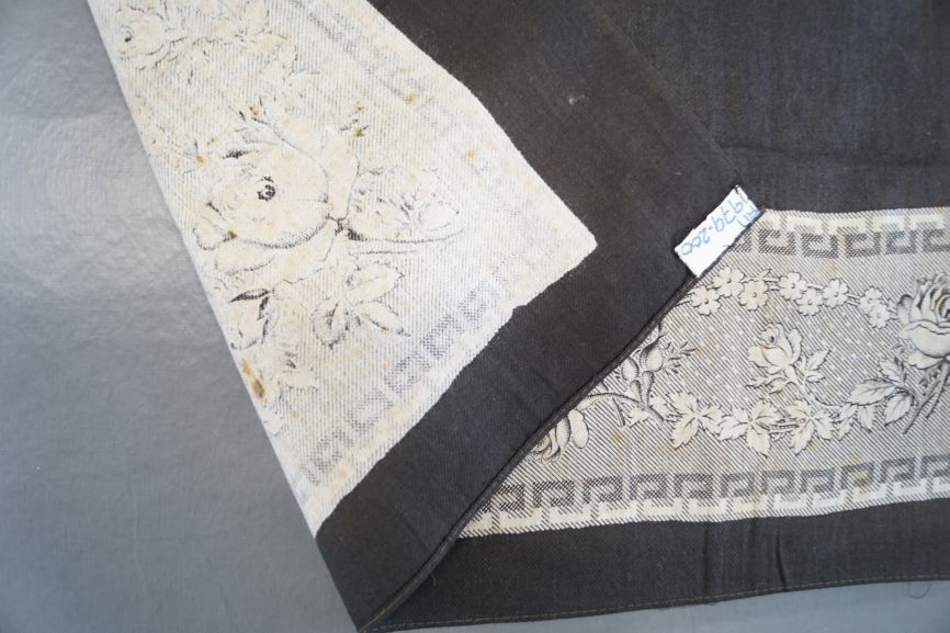 Zwart bedrukt katoenen doek met rand met afwisselend roos en krans omzoomd met meanderrand