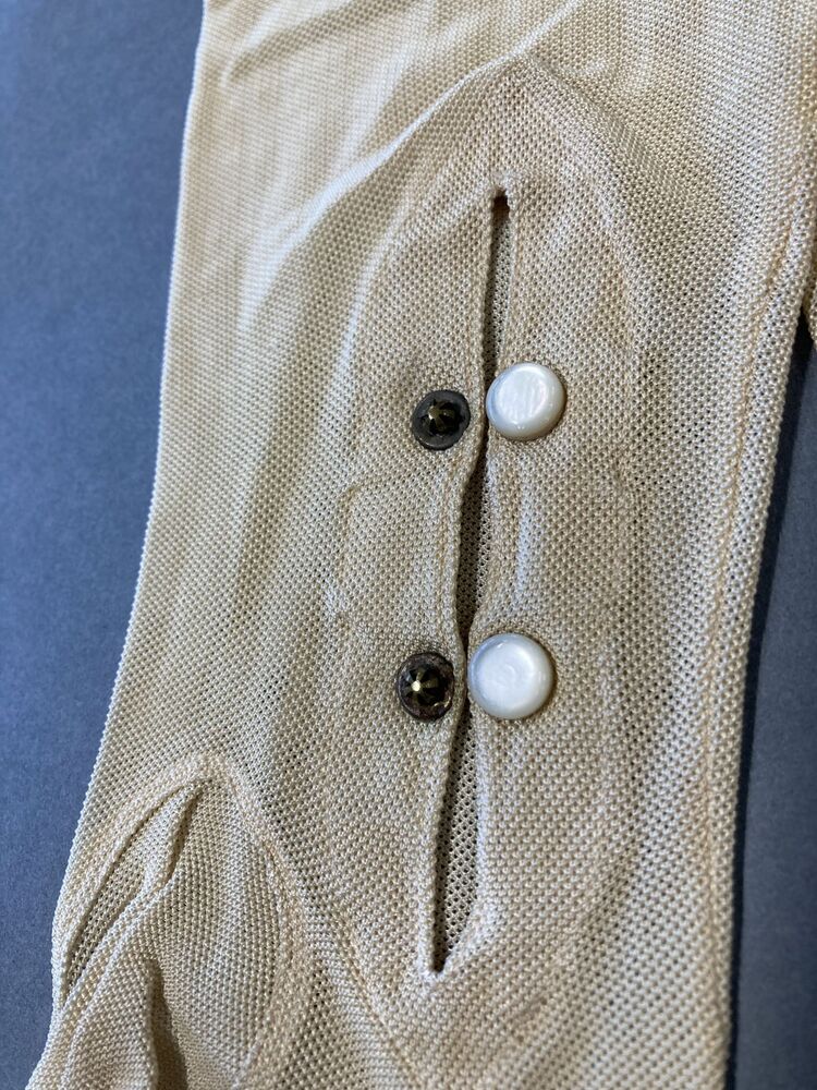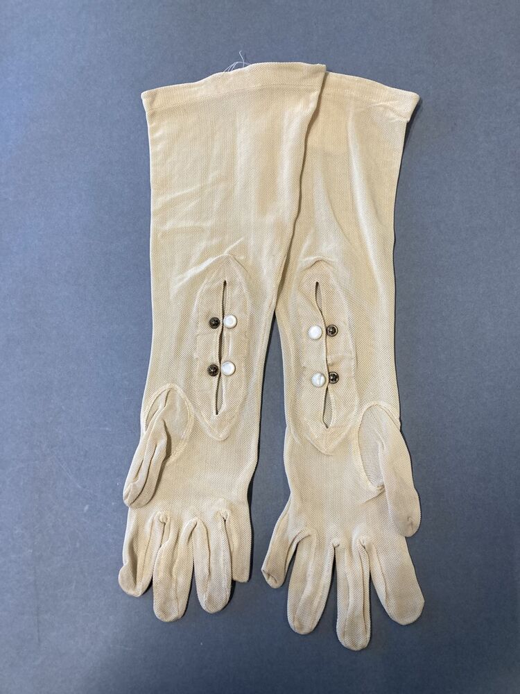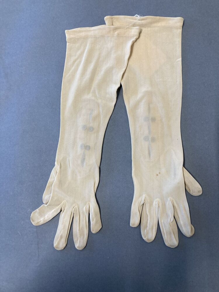 Paar crèmekleurige dameshandschoenen van tricot met klein ajour werkje