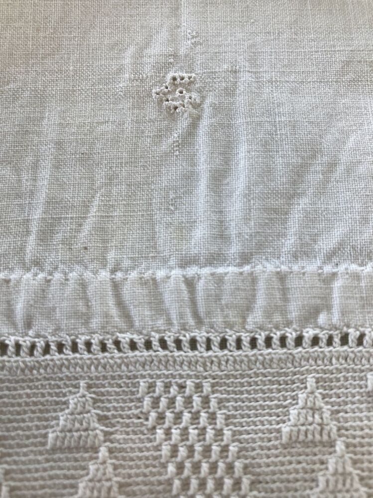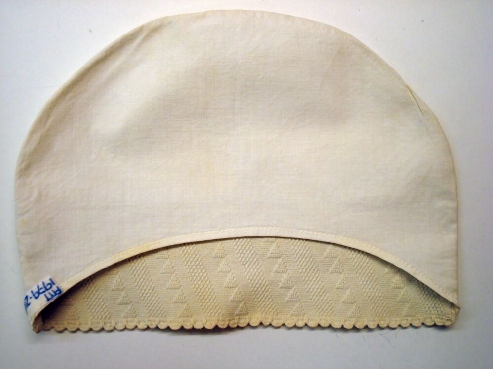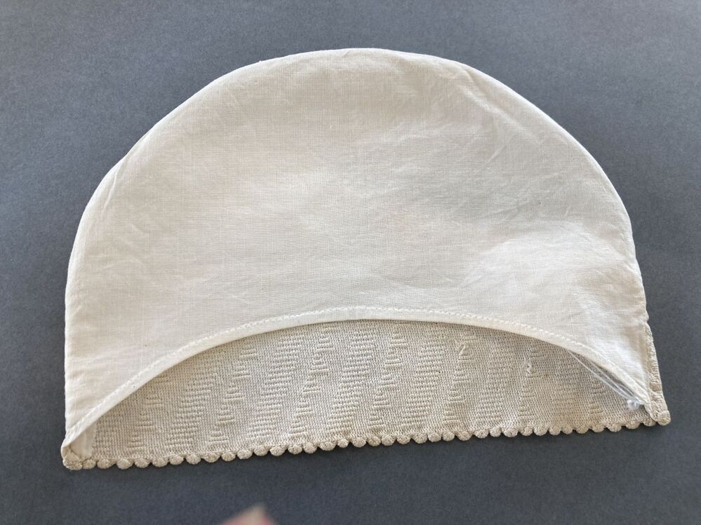 Wit katoenen tipmuts, met gehaakte strook, initiaal G in stersteek,