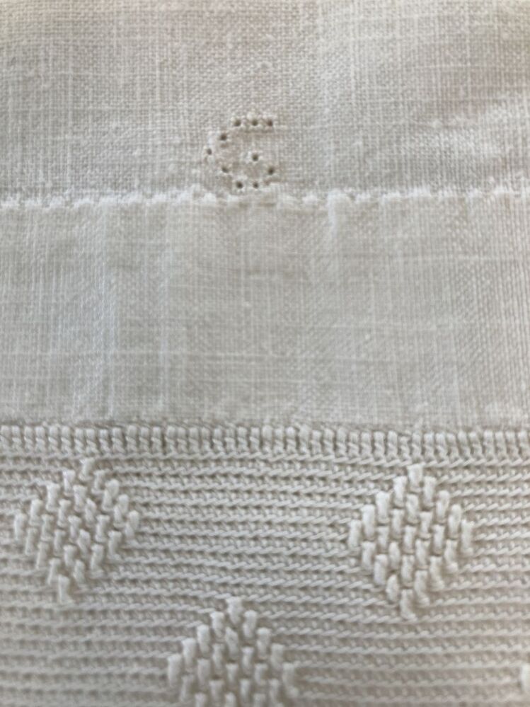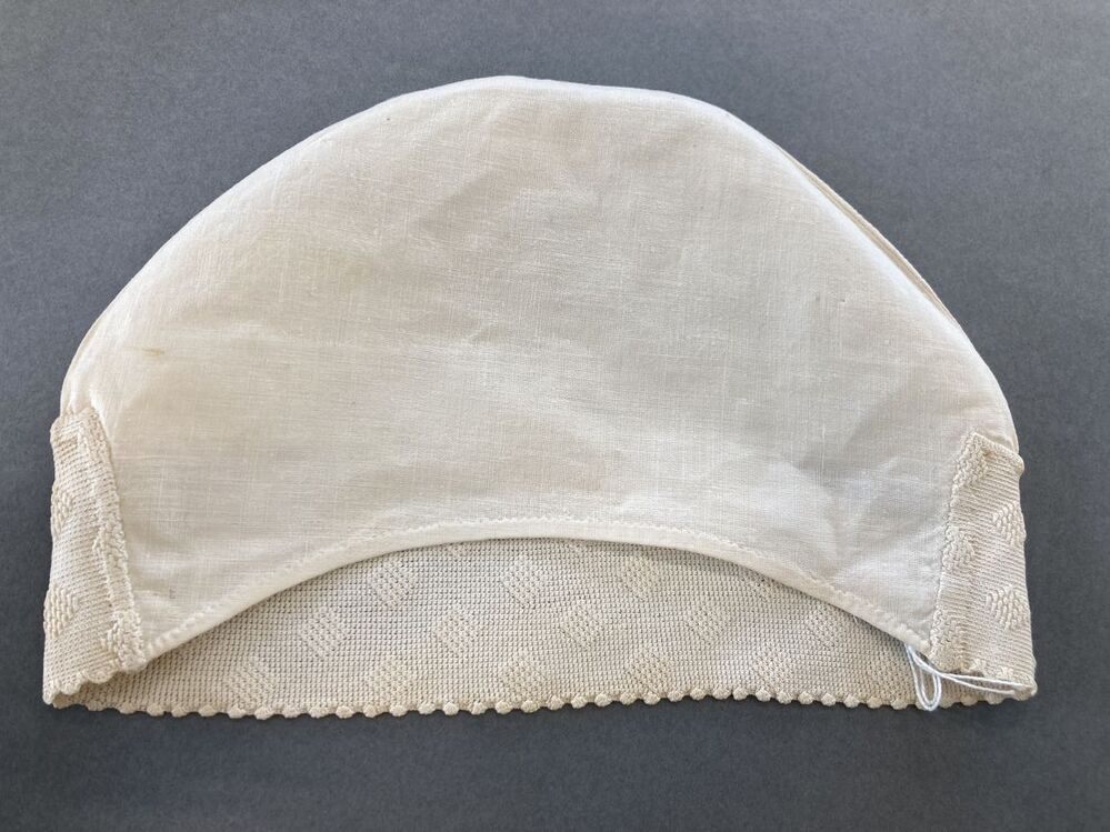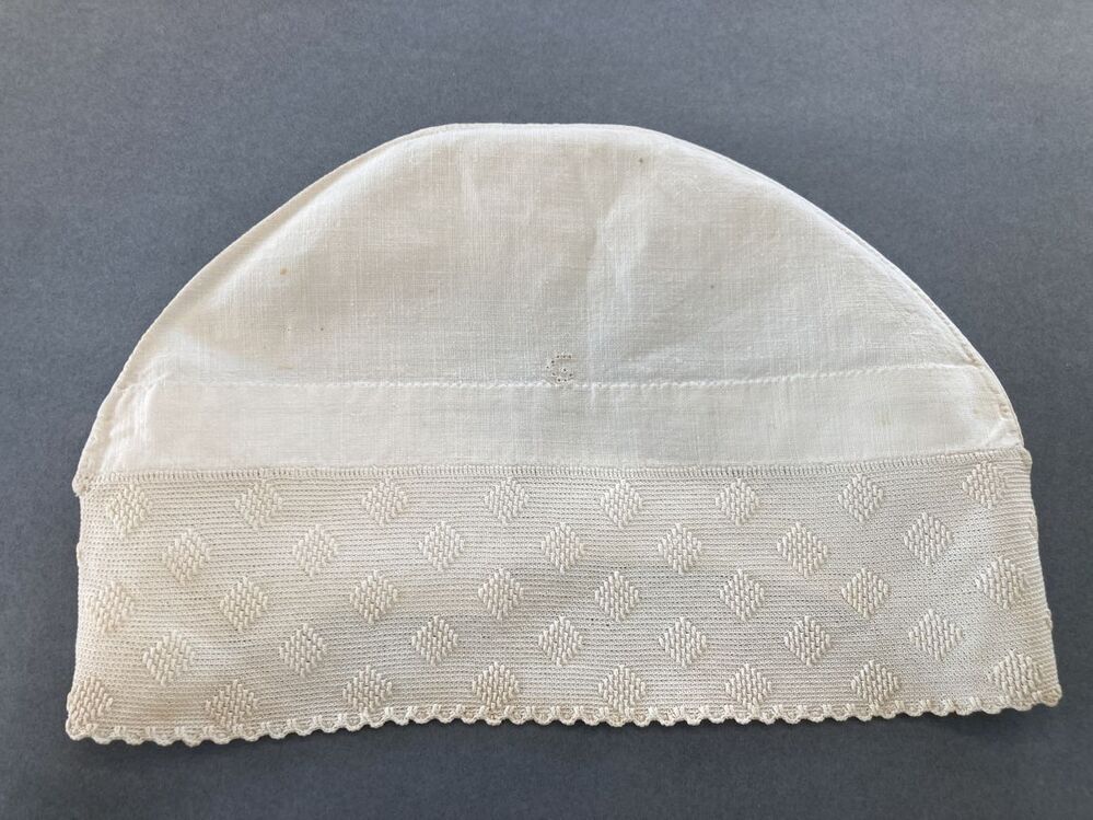 Wit katoenen tipmuts, met gehaakte achterstrook, monogram G in stersteek
