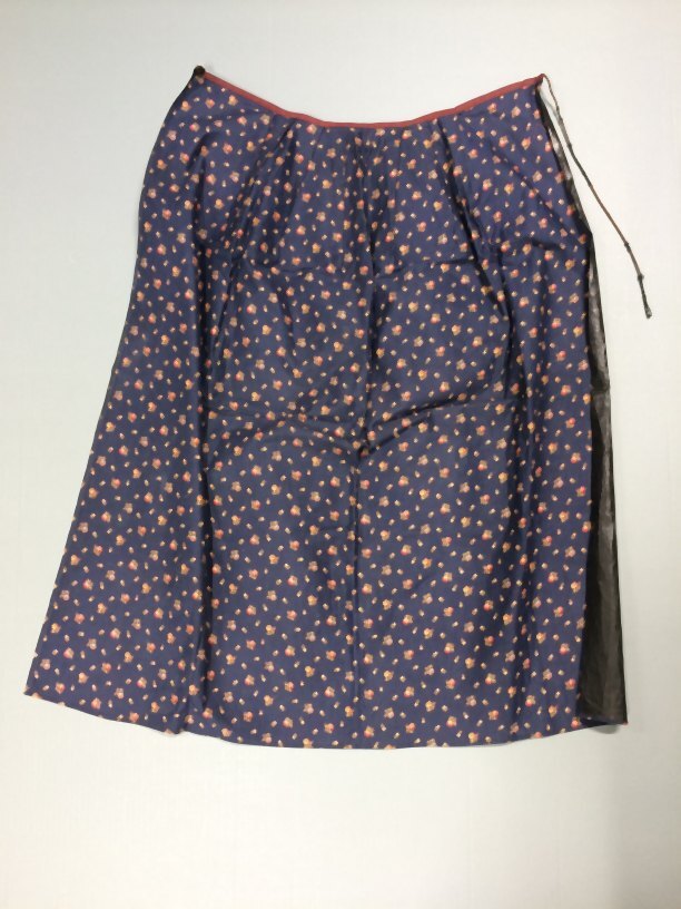 Schort van bedrukte katoenen zeildoek, blauw fond, bestrooid met bloemen