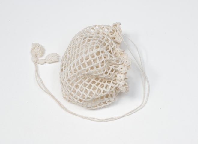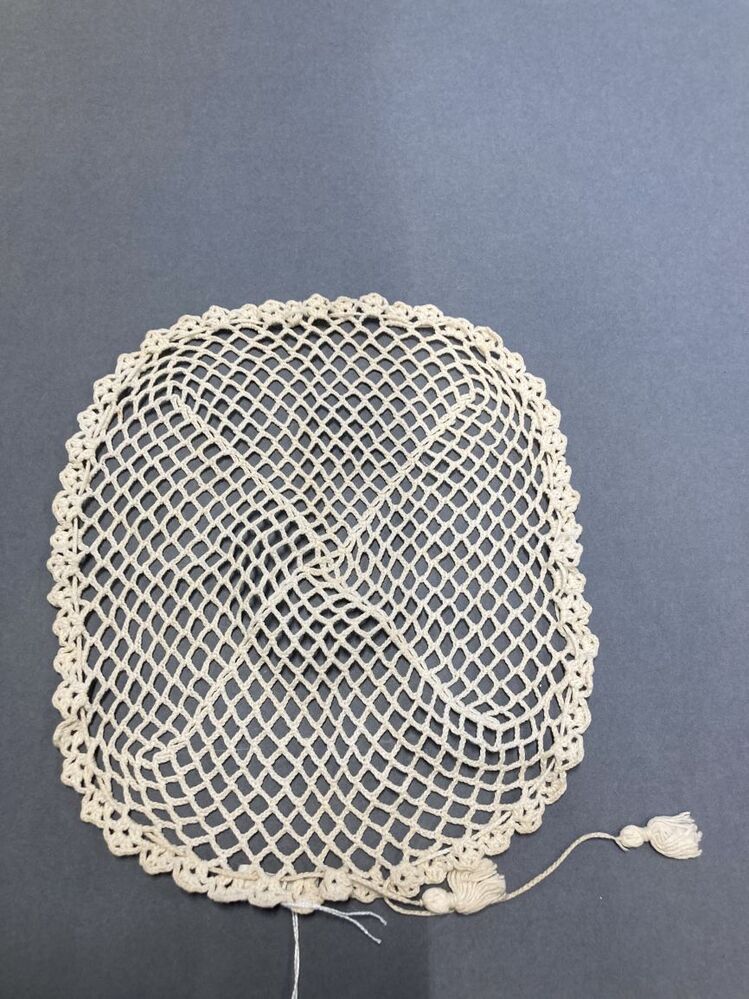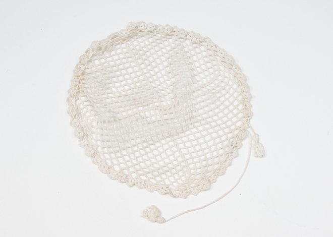 Haarnet voor een wrong in de vorm van een tasje gehaakt van wit katoen in netpatroon met schulpenrand