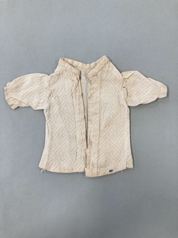 Poppenjakje van wit katoen met ingeweven motief met diagonale lijnen , kortemouwen en ronde naden