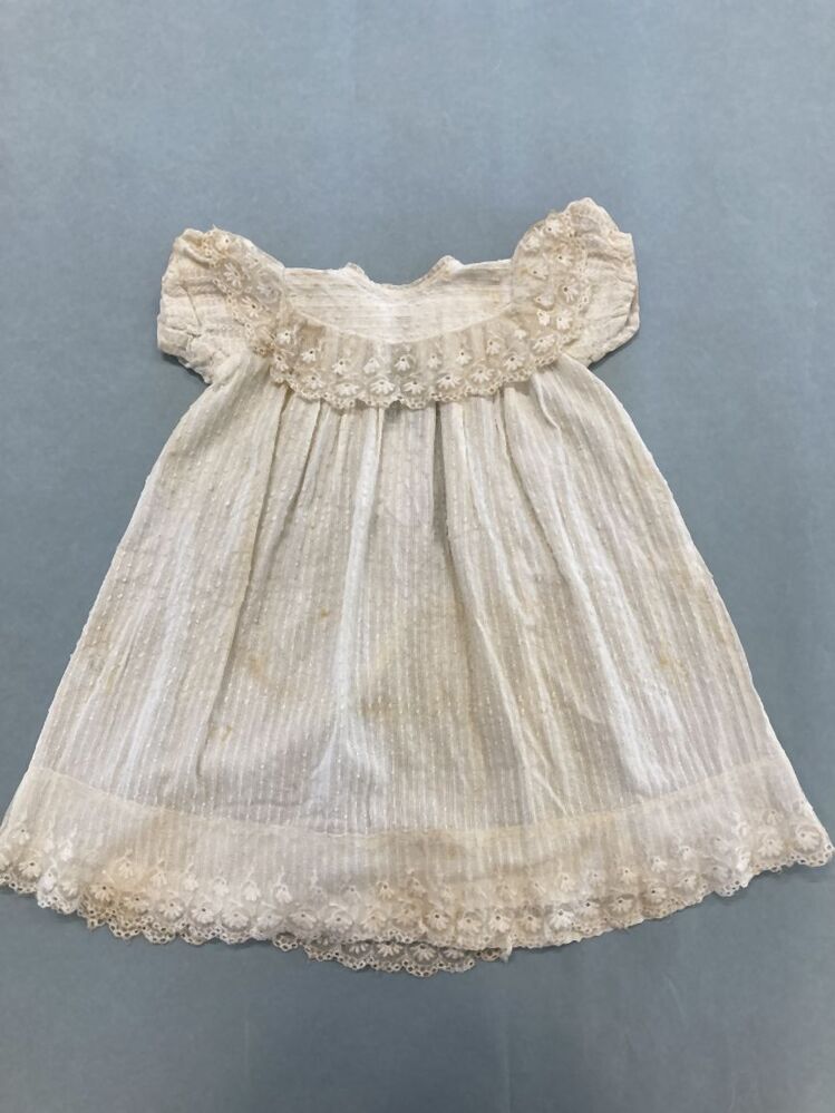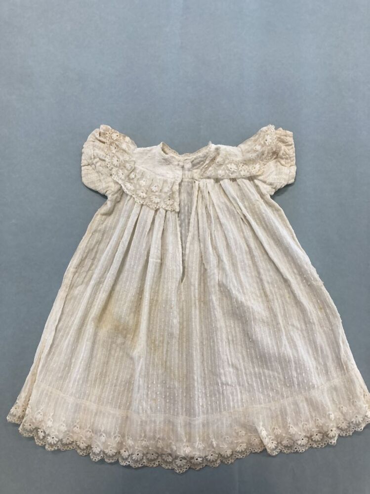 Kinderjurkje met pofmouwtjes van wit katoen met ingeweven ajour streepeffekt