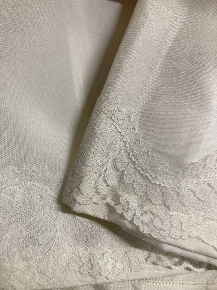 Jupon of onderrok van voeringstof verstevigd met vlieseline, met strook kant langs de zoom, tailleband van elastiek, onderdeel van bruidskleding