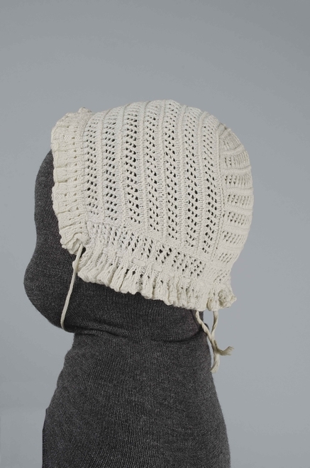 Gebreid wit katoenen kindermutsje, onderdeel van groep van drie