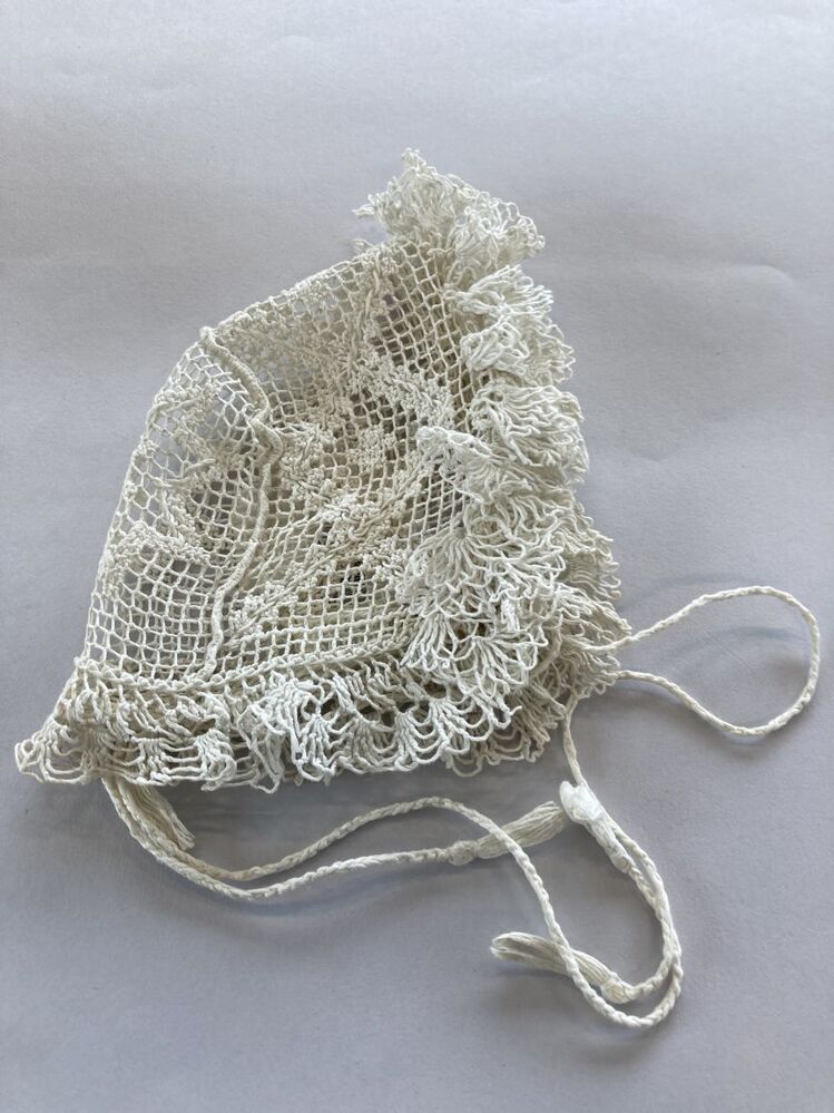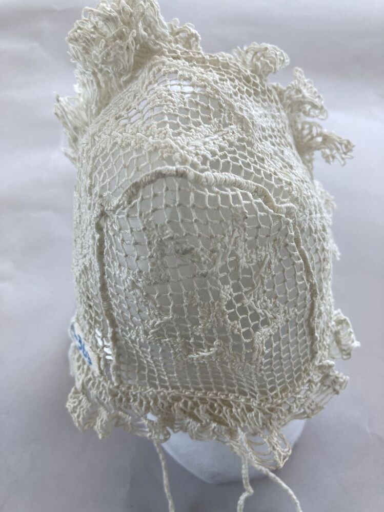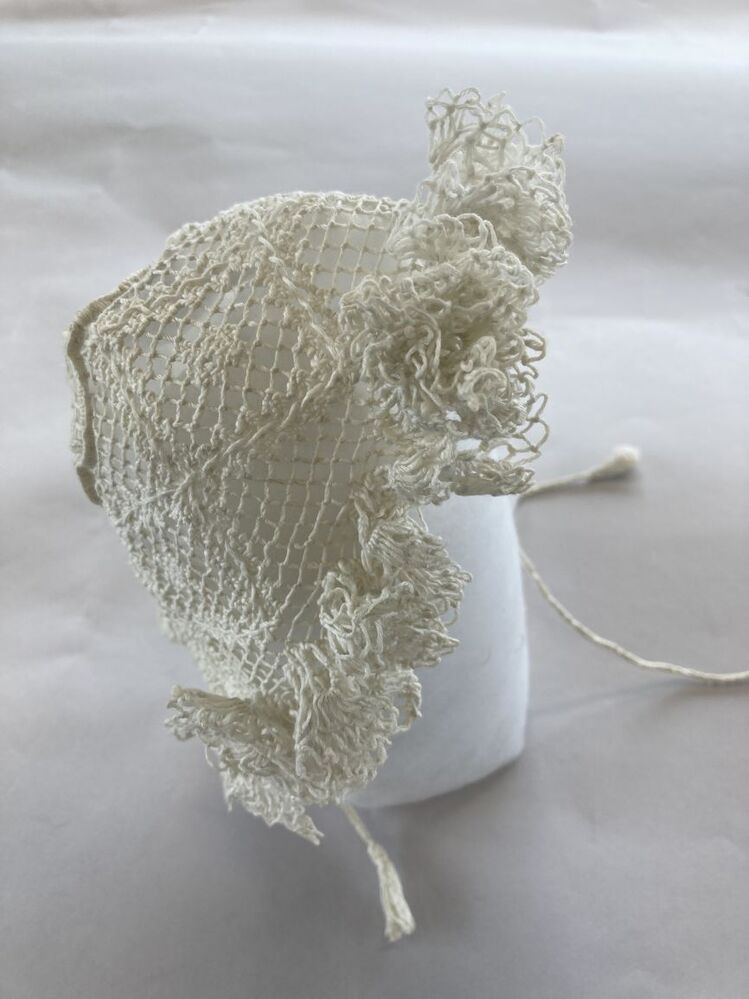 Kindermuts van wit katoen, filetknopen en doorstoppen, met 'hanekam'