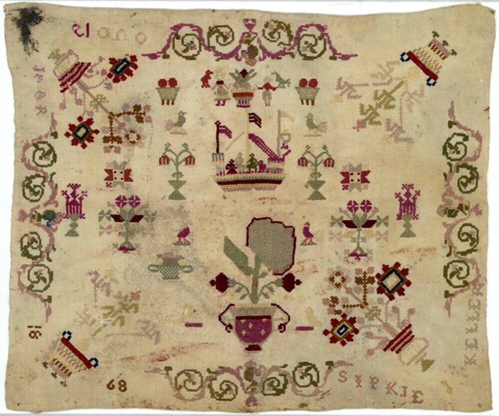Merklap met diagonaal geplaatste bloempotten, gemerkt Sipkje J. Keller, 1868