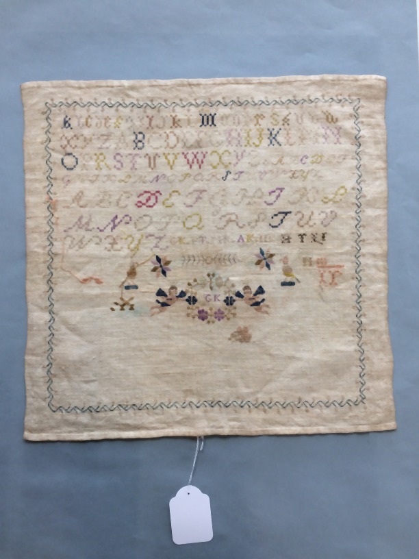 Lettermerklap van wit linnen, geborduurd met linnen en zijde in kruissteek, onaf, met zeven rijen letters