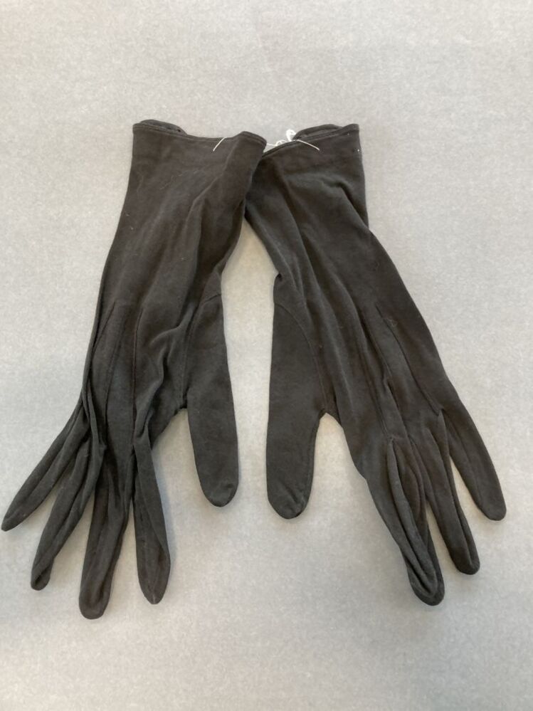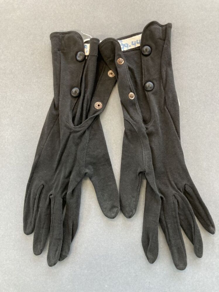 Paar dunne zwarte handschoenen van tricot, gesloten met twee drukknopen, onderdeel van groep van drie paar