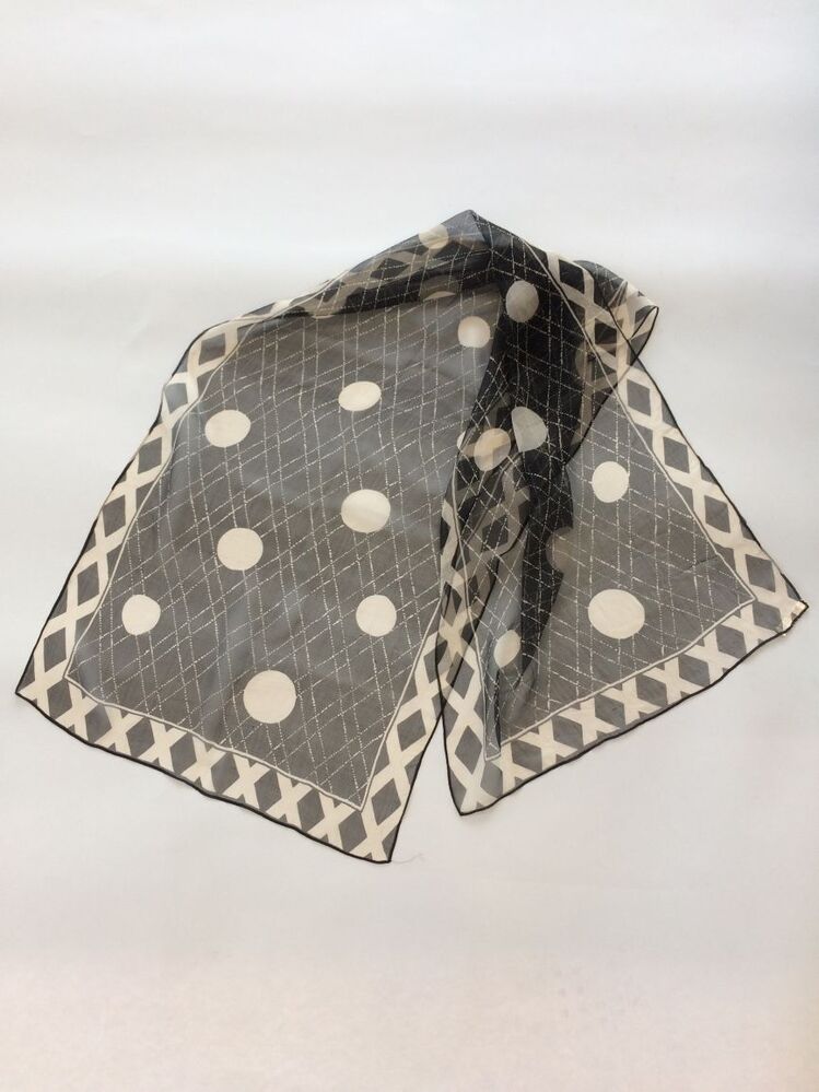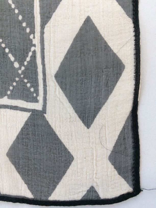 Bedrukte sjaal van zijden voile, zwart op wit, middenveld met diagonale ruiten met witte noppen en rand met kruisen.
