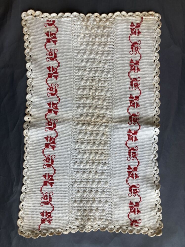 Wit katoenen beddekleedje of wastafelkleedje, van tunisch haakwerk, met rood kruissteekborduurwerk