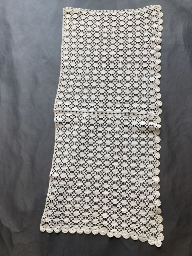 Gordijntje gehaakt van wit katoen in ajourpatroon met ovale vlakjes, langs twee zijden een geschulpte rand.