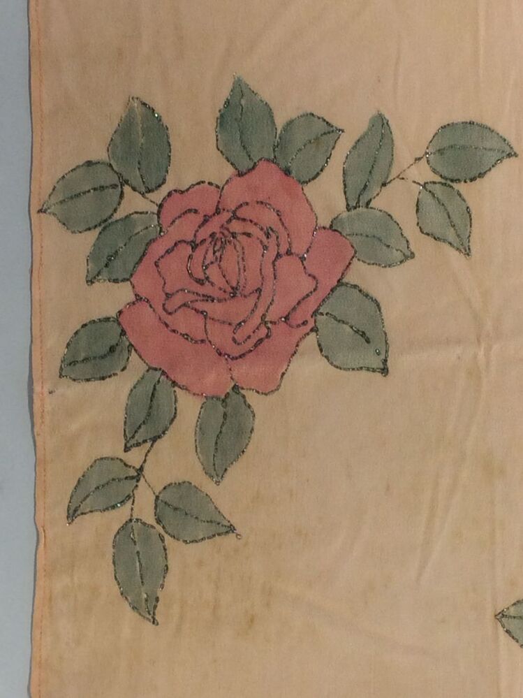 kleedje van kunstzijde of rayon beschilderd met roze rozen met groene bladeren en zilver contour