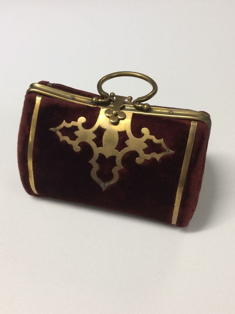 Handwerktasje van wijnrood fluweel met koperbeslag